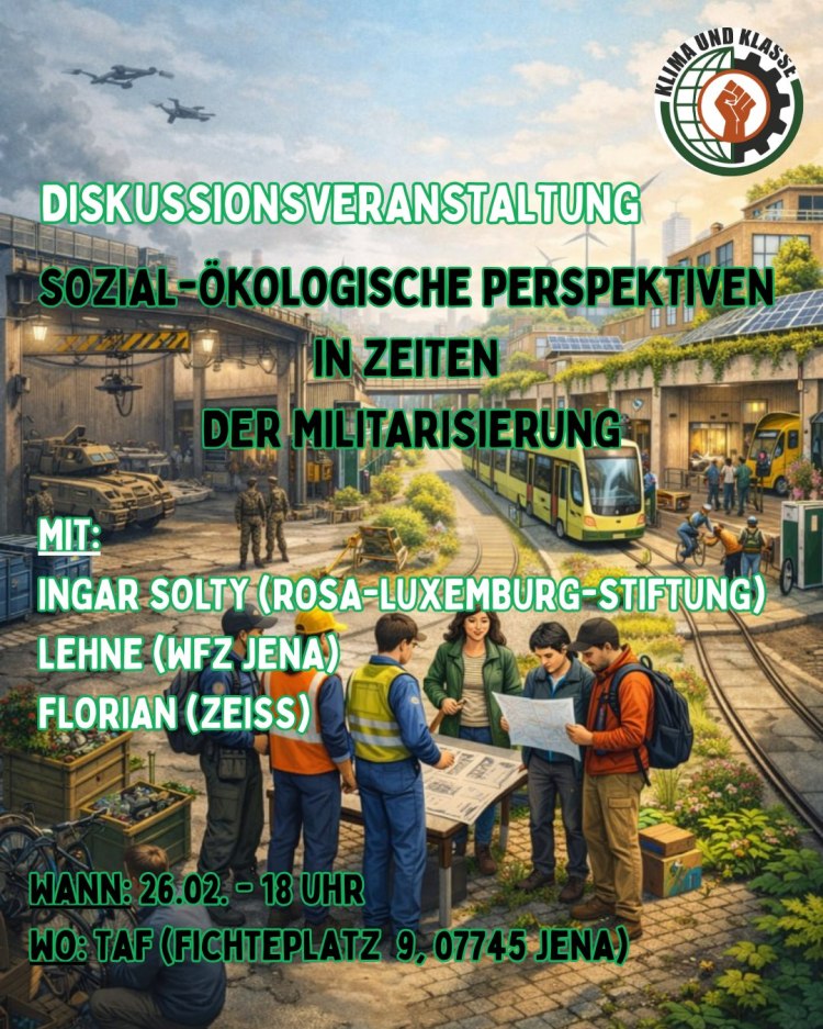 Am 26. Februar 2026 haben wir mit Ingar Solty, Lehne von Wir Fahren Zusammen und Florian, aktiv in der IG Metall bei dem Unternehmen ZEISS diskutiert. Thema war die Zukunft der Industrie vor dem Hintergrund gegenwärtiger Aufrüstungs- und Deindustrialisierungstendenzen sowie eines Anstiegs sozialer Ungleichheiten zu diskutieren.