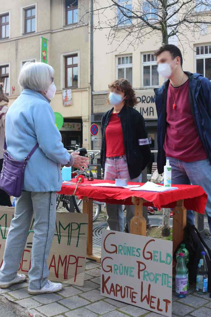 Wir konnten mit Passanten ins Gespräch kommen und haben für unsere Perspektive auf die Lösung von ökologischer und sozialer Krise geworben. Wir diskutierten dabei die kapitalistischen Ursachen der Umweltkrise und argumentierten, warum eine Kritik am individuellen Kaufverhalten und die Hoffnung auf ‚grüne Märkte‘ für falsch und unsozial halten.